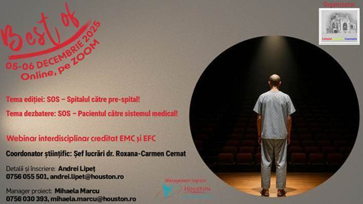 În perioada 5–6 decembrie 2025 - Colegiul Medicilor Constanța - organizează ediția a IX-a a webinarului interdisciplinar Best OF, creditat cu 12 EMC pentru medici și 16 EFC pentru farmaciști, în curs de creditare EMC pentru asistenți medicali și membri OBBCSSR.